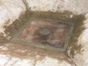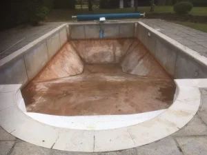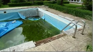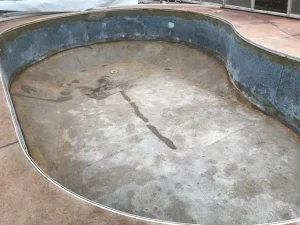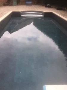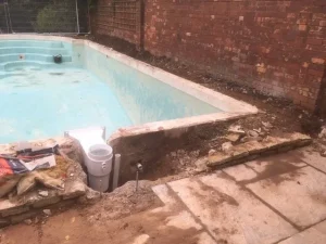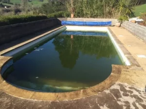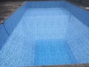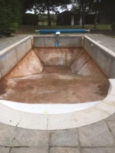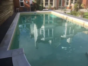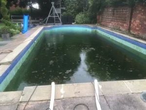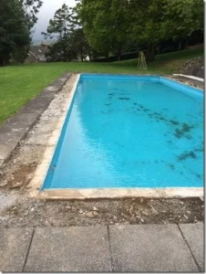 Before and after of an unusual shaped pool at Croft Holiday Cottages in Watchet. Replacement main drain and associated pipework and a replacement liner in Persia Blue.