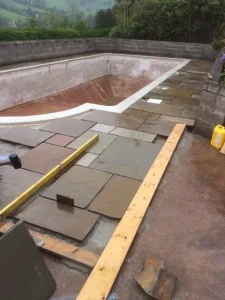 Bovey Tracy was a full refurbishment including new pool fittings and pipework, new internal steps, new coping stones, relaid patio surround and site liner.
