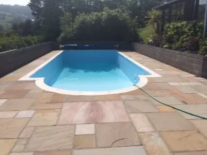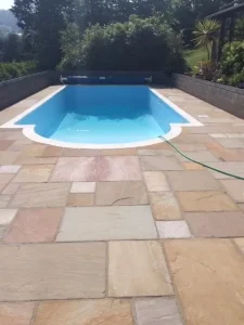 A complete refurbishment on a pool near Torquay including replacement pool fittings and associated pipework, site lining in plain blue and a new patio and pool surround including coping stones.